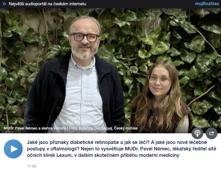 Jaký je život s očním onemocněním způsobeným cukrovkou? Tuto otázku otevřel pořad Českého rozhlasu Cesta k uzdravení. Svou osobní zkušenost s bojem o zachování zraku v něm sdílela naše pacientka Viktória. Odborný kontext a lékařský vhled připojil MUDr. Pavel Němec, lékařský ředitel sítě očních klinik Lexum a zároveň Viktóriin operatér.