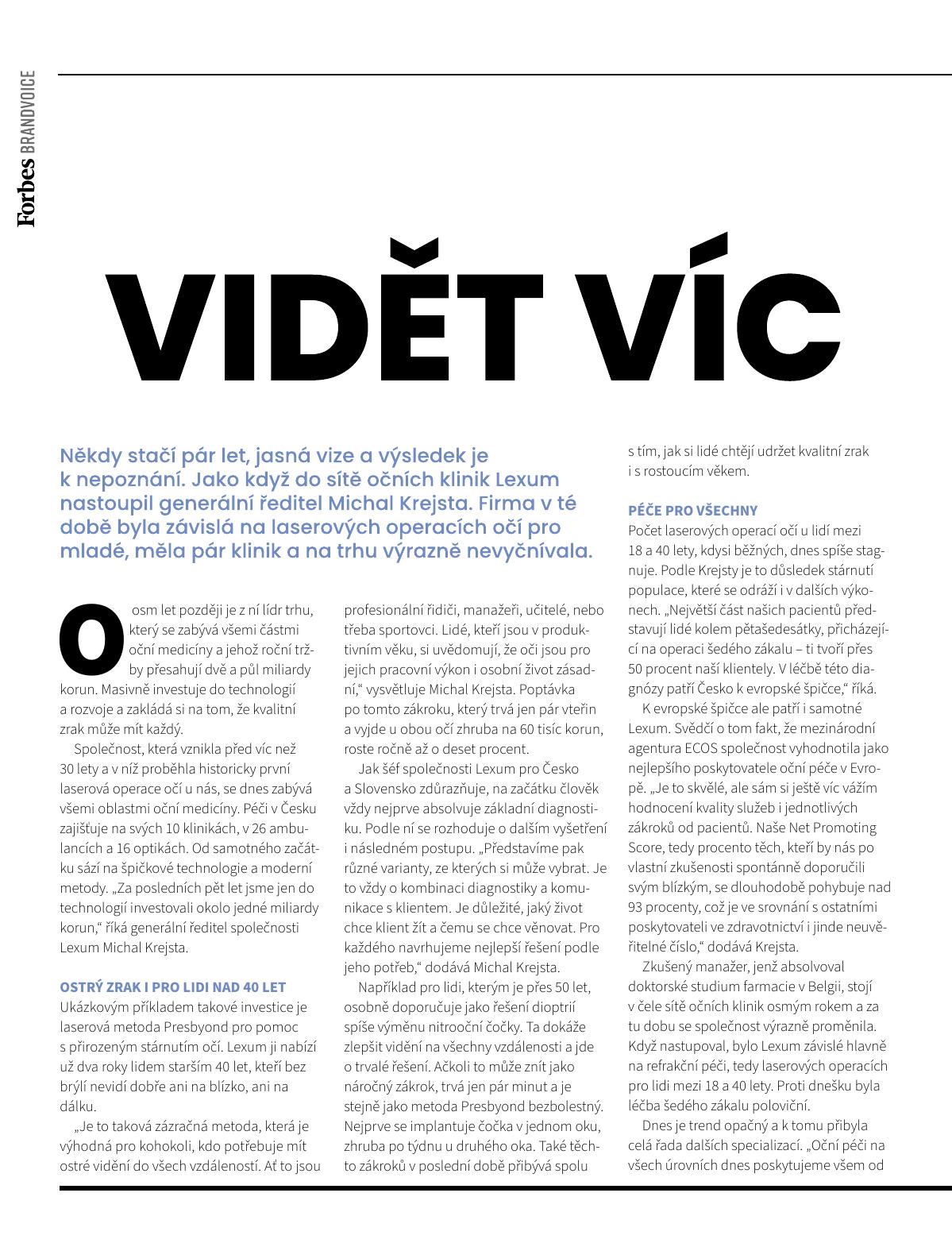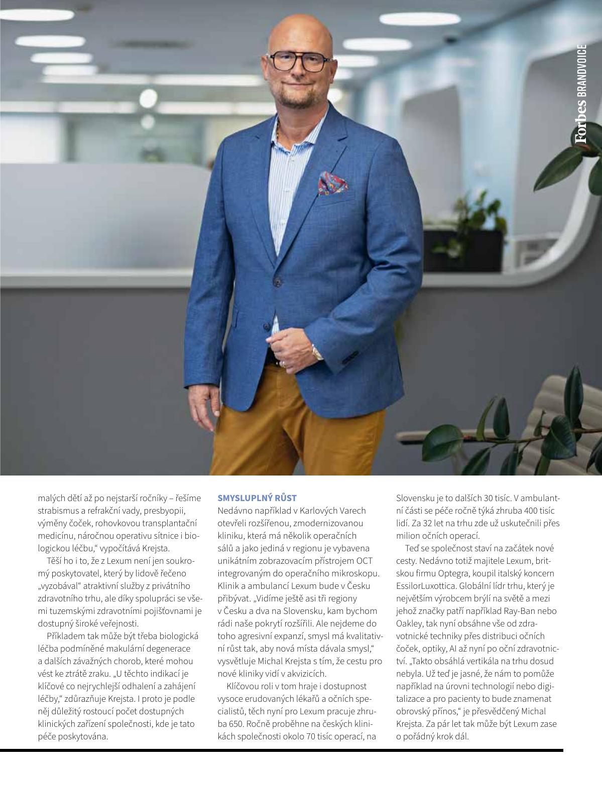 Věděli jste, že první laserová operace očí v ČR byla provedena v Lexum? Od té doby ušla naše síť očních klinik pořádný kus cesty. Pro magazín Forbes hovořil o vývoji v posledních letech PharmDr. Michal Krejsta, MBA, LL.M., MHA, předseda představenstva a generální ředitel Lexum.